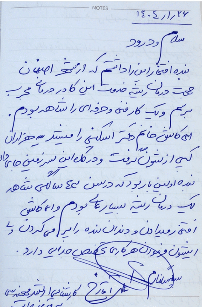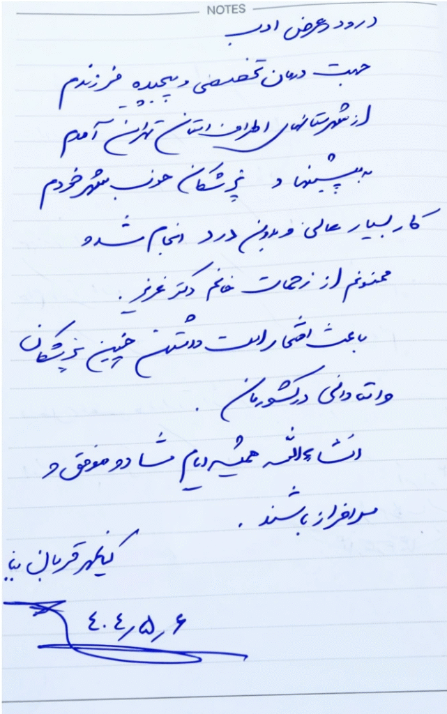 بنده افتخار این را داشتم که از شهر اصفهان جهت درمان ریشه خدمت این کادر درمان مجرب برسم و یک کار فنی و حرفه ای را شاهد بودم.