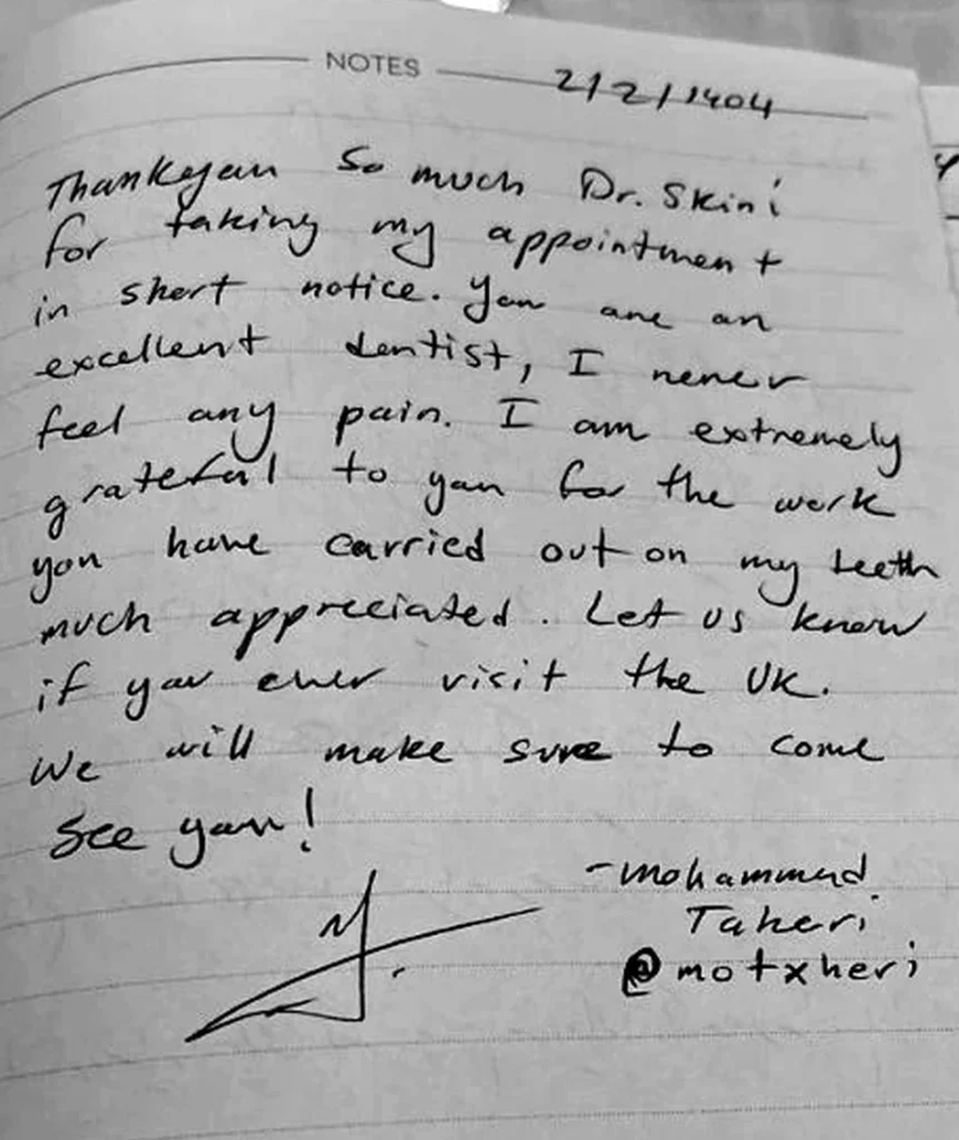 Thank you so much Dr. Skini for taking my appointment in short notice. You are an excellent dentist, I never feel any pain. I am extremely grateful to you for the work you have carried out on my teeth much appreciated. Let us know if you ever visit the UK. We will make sure to come see you!